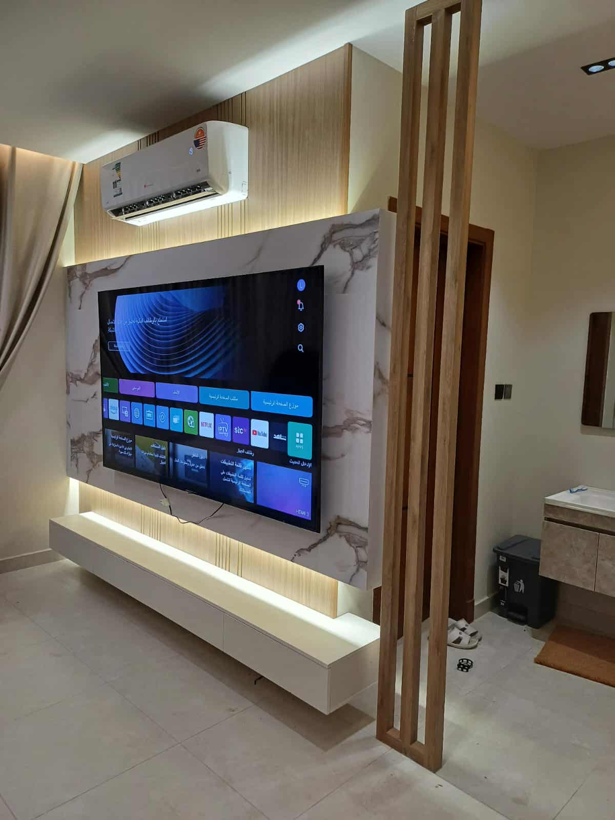 تشطيب خشبي مع إضاءة LED يمنح الصالة طابعًا راقيًا وعصريًا.